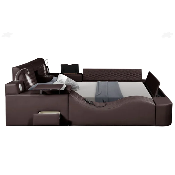This innovative bed combines comfort and technology seamlessly. From the remote-controlled massage lounge to the built-in Bluetooth speakers and USB charging ports, every feature is designed for convenience and relaxation. The padded headboard and durable engineered wood frame ensure long-lasting comfort and quality.